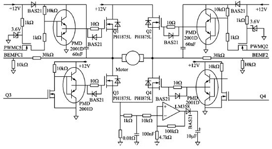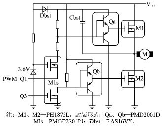 MOSFET驅動提升了控製器輸出信號驅動電機的能力。本設計選擇NXP芯片PMD2001D和PMGD280UN,如圖7所示。