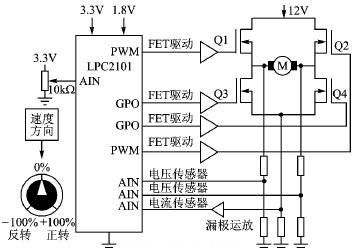 PWM信號(Q1和Q2)根據LPC2101微控製器定時器2的3個(ge) 匹配寄存器決(jue) 定信號的時基頻率。電機速度(占空比)和方向通過調整電位器輸入及改變LPC2101 ADC的輸入數值來控製,如圖4所示。
