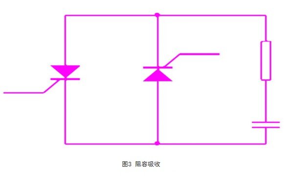 在晶閘管兩(liang) 端並聯r-c阻容吸收回路,如圖3所示,利用電容吸收過壓。其實質就是將造成過電壓的能量變成電場能量儲(chu) 存到電容中,然後釋放到電阻中消耗掉。