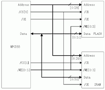 圖2 MPC555微控製器外擴Flash和SRAM存儲(chu) 器的連接圖