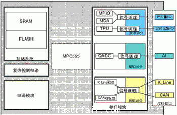 係統硬件架構采用Freescale公司的MPC555作為(wei) 控製核心,由電源模塊、存儲(chu) 係統、複位電路和接口模塊幾部分組成。由於(yu) 係統是麵向汽車電子應用的,為(wei) 保證係統的在汽車電子領域的開放性,應對汽車電子領域常用的接口信號進行處理,采用相應的專(zhuan) 用接口芯片以滿足要求。同時,係統提供豐(feng) 富的 I/O資源也有利於(yu) 滿足開放性的要求。係統架構如圖1所示。