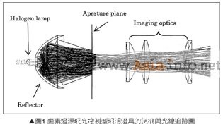 如圖1所示使用鹵素燈建構光學係統時,大多利用橢圓形反射鏡將光線集中至開口處投影。發光二極管的場合,單位發光二極管的光束很少,當作照明光源使用時必須使用數個(ge) ~數十個(ge) 發光二極管,因此複數光源產(chan) 生的光線控製非常重要。