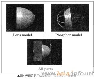 上述大型照明燈具,光學組件接近光源設置的場合,必須考慮發光二極管內(nei) 部結構模型化。模型化首先量測發光二極管的形狀與(yu) 熒光體(ti) 的尺寸。鏡片形狀的模型化使用式(1)非球麵方程式,以最小自乘法進行與(yu) 量測值的優(you) 化(Fitting)。發光部位則進行熒光體(ti) 發光的模型化,各部位的發光強度則與(yu) 激發強度呈比例。