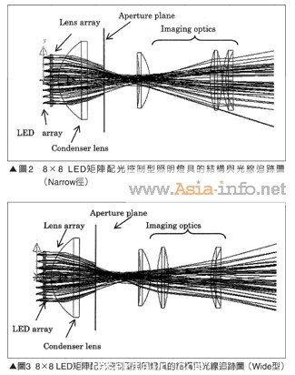 複數LED當作配配光控製型照明燈具使用時,必須結合高功率發光二極管與(yu) 光學係統,利用鏡片數組(Array)將發光二極管產(chan) 生的光線準直化(Collimate),接著再透過聚光鏡片(Condenser Lens)使光線在開口處混合集光,最後再利用成像光學係統使該開口光源影像變倍投影,進行所謂的“配光控製”。此外使用鏡片數組與(yu) 聚光鏡,還可以消除照射麵的亮度不均與(yu) 色不均等問題。