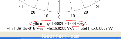 由此可見:該光學係統中有41.88%的光是直接照射,不需經過光學係統,即能量損失為(wei) 0,另有58.12%的光需要經過反射壁反射,反射效率取決(jue) 於(yu) 反射壁材料及加工工藝。通過鍍增強鋁膜或者銀模,反射效率可以達到90%以上,因此反光係統效率可以達到並超過以下數值: