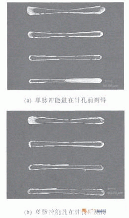 從(cong) 圖4和圖5中可以看出,單脈衝(chong) 能鼉較低時,不管是開孔還是一定針孔作用下焦點附近脈衝(chong) 形狀不存在明顯紡錐型分布,但加針孔後焦點附近光束半徑變化還是舒緩了很多,較利於(yu) 進一步做深加工與(yu) 切割方麵的研究;隨著針孔直徑的降低,能夠實現燒蝕的區域在明顯減小(小於(yu) 瑞利長度),這主要是針孔限製了大部分能量到達材料表麵;小孔直徑為(wei) 4mm時,脈衝(chong) 傳(chuan) 輸形狀受激光能量的影響相對較小;與(yu) 圖3類似,實驗另一個(ge) 現象就是隨著針孔孔徑的減小,聚焦區域的最小束腰半徑處向靠近透鏡方向移動,這一點可以用聚焦束腰半徑與(yu) 聚焦前束腰與(yu) 透鏡前表麵距離的變化關(guan) 係來很好解釋。