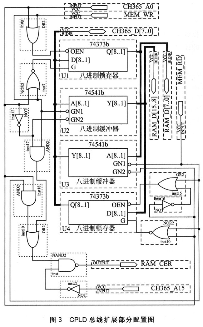 CPLD芯片選用A1tera公司生產(chan) 的EPM7064,通過CH365地址線A0的使能對16位數據進行分時讀/寫(xie) ,從(cong) 而解決(jue) 了數據總線的擴展問題。其內(nei) 部邏輯電路如圖3所示,其中主要包括2個(ge) 鎖存器(74373b),和2個(ge) 三態門緩衝(chong) 器(74541b)。