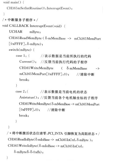 數據反饋功能主要是通過CH365響應DSP中斷來實現的。DSP程序將數據寫(xie) 入雙口RAM低4 KB空間後向CH365申請中斷,CH365響應中斷將數據反饋到PC並顯示到人機界麵。中斷函數部分代碼如下: