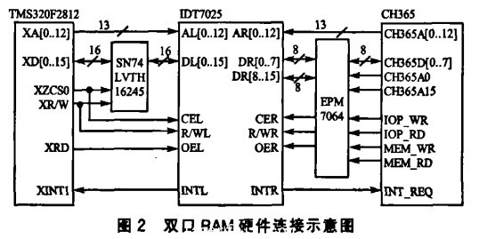 係統采用了雙口RAM作為(wei) DSP和CH365之間數據傳(chuan) 輸的緩衝(chong) 芯片,而TMS320F2812的地址總線為(wei) 19位,IDT7025為(wei) 13位,CH365為(wei) 16位,因此,把IDT7025的13位地址線A[O..12]分別與(yu) DSP的地址線XA[O..12]和CH365的地址線A[O..12]相連,並將CH365的地址線A0用作數據總線擴展的使能信號。