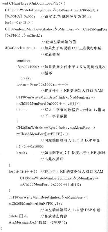 由上述可知,雙口RAM的高4 KB空間用於(yu) PC機向DSP下載數據,如果數據大於(yu) 4 KB,則存在著一次不能夠把全部數據下載到DSP中的問題。因此,采取了向雙口RAM中循環寫(xie) 入數據的辦法,即PC機向雙口RAM一次隻寫(xie) 入4 KB數據,接著向DSP申請中斷。DSP響應中斷一次性將4 KB數據複製到DSP其他大容量存儲(chu) 空間(如擴展SRAM)中,然後釋放雙口RAM空間。此時PC機便可再寫(xie) 入4 KB數據,如此循環往複,直到將所有數據都寫(xie) 入DSP中。部分代碼如下: