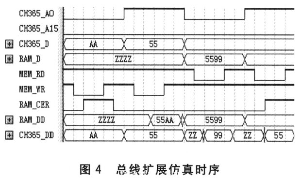 對上述邏輯關(guan) 係用“MAX+PLUS”進行仿真後,得到圖4所示的時序。圖中RAM_DD和CH365_DD表示仿真結果,從(cong) 圖中可知仿真結果完全符合設計要求。