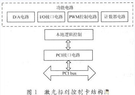 激光標刻係統控製卡是整個(ge) 控製係統的中樞,連接著控製軟件與(yu) 執行機構。控製卡結構如圖1所示,包括基於(yu) PCI總線接口控製電路、本地邏輯控製電路及功能電路等3部分組成。