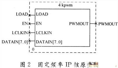 IP軟核4 kHz的輸出頻率通過對33 MHz時鍾8 196分頻獲得。8位的控製精度可實現占空比0~1的256級調節,其軟核的原型符號如圖2所示。其中,Load作為(wei) 控製數據載入控製端,在該信號有效時,將8位控製數據IN[7..O]載入內(nei) 部控製寄存器。EN信號為(wei) 輸出有效信號,用於(yu) 控製PWM輸出,當該信號有效時,輸出PWM。LCLKIN信號提供IP軟核的工作頻率,PWM輸出信號的基頻是由該信號分頻得出的。