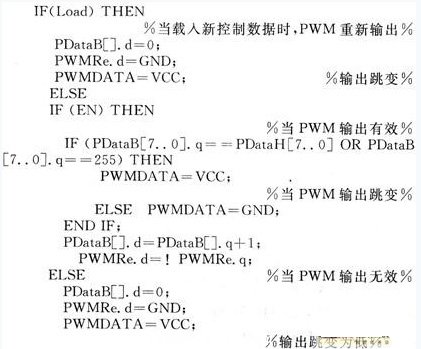 軟核內(nei) 部控製語句如下,其中PWMDATA為(wei) PWM波輸出的控製邏輯,當其輸出為(wei) 高電平時,輸出進行翻轉。