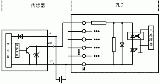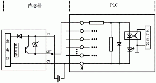 PNP集電極開路輸出為(wei) +V高電平,當輸出OUT端和PLC輸入相連時,電流從(cong) PLC的輸入端流入,從(cong) PLC的公共端流出,此即為(wei) PLC的源型電路的形式,即:PNP集電極開路輸出隻能接源型或混合型輸入電路形式的PLC,連接圖如圖11所示: