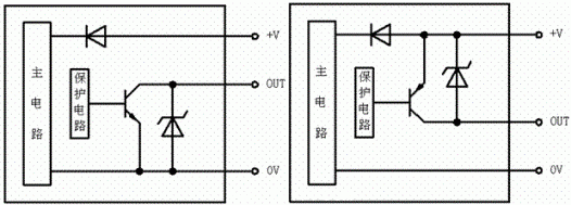 從(cong) 圖8和圖9可以看出,NPN集電極開路輸出電路的輸出OUT端通過開關(guan) 管和0V連接,當傳(chuan) 感器動作時,開關(guan) 管飽和導通,OUT端和0V相通,輸出0V低電平信號;PNP集電極開路輸出電路的輸出OUT端通過開關(guan) 管和+V連接,當傳(chuan) 感器動作時,開關(guan) 管飽和導通,OUT端和+V相通,輸出+V高電平信號。