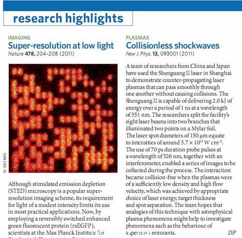 近日獲悉,由中、日、韓三方八個(ge) 研究單位組成的聯合實驗小組在神光Ⅱ裝置上進行的無碰撞衝(chong) 擊波實驗物理成果在New Journal of Physics(X Liu et al 2011 New J. Phys. 13 093001)上發表後,被Nature Photonics(David Pile. 2011 Nature Photonics 5, 644,該刊影響因子為(wei) 26.508)在Research Highlights中重點推介。該報道以Collisionless shockwaves為(wei) 標題,稱研究小組使用上海神光Ⅱ激光裝置演示相向傳(chuan) 播但可以無碰撞自由相互穿行的實驗。