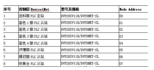 由於(yu) 版麵原因,編碼器數量不能全部標示出來。另外,各個(ge) 機構的位置調整,隻是在更換生產(chan) 料號時才動作,因此客戶為(wei) 了節省成本,每個(ge) 機台隻安裝2台變頻器作調速定位,依靠外部接觸器切換各個(ge) 機構的電機工作,因此每次最多隻有2個(ge) 位置調整機構同時動作。人機界麵通過Ethernet網絡,先訪問DeviceNet控製層的主站送料部PLC,再通過DeviceNet網絡訪問到各個(ge) 從(cong) 站PLC。每一個(ge) 機台的2個(ge) PLC通過RS485的PLC-Link方式交換數據。地址(Node Address)分配如表2、3所示。