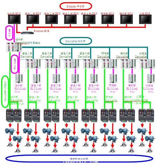 由於(yu) 設備層是各自PLC站點下屬的獨立網絡,因此可以定義(yi) 相同的節點地址也不會(hui) 產(chan) 生幹涉,反而方便編程(例如,套色1到套色4機構相同,都可以使用相同的PLC程序)。