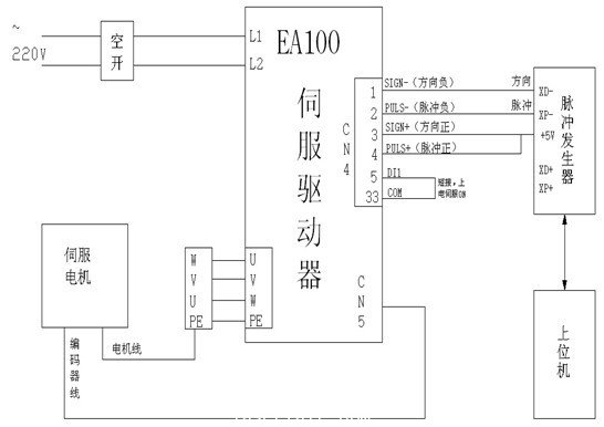 伺服驅動器工作在位置模式,以X軸為(wei) 例,係統原理圖如下圖所示。通過脈衝(chong) 控製卡的脈衝(chong) 輸出來控製伺服電機,方向信號控製電機的運轉方向。 Y軸Z軸與(yu) X軸控製原理相同。
