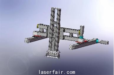 根據用戶對機器人強度高,負載大,運動精度高等要求及人工裝卸零件的方便性和光路要求,我們(men) 設計了兩(liang) 款五軸連動機器人。它們(men) 的結構原理上相同,主要由一個(ge) 龍門式三軸直角坐標機器人和兩(liang) 個(ge) 轉動軸組成。由於(yu) 負載重,直角坐標機器人的Z軸采用了如圖2所示的雙Z軸滾珠絲(si) 杆同步驅動。