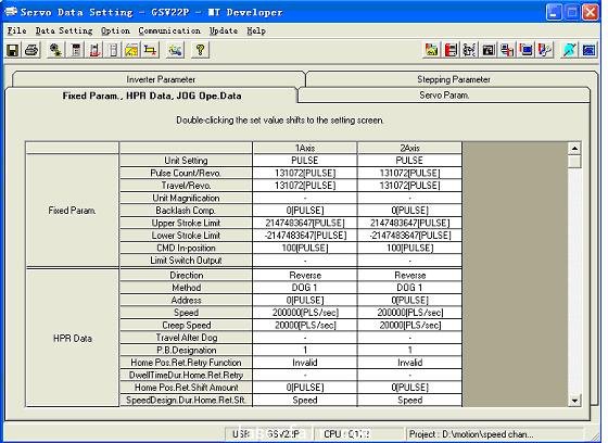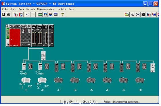 如果有必要,還可以根據需要進行共享參數設置,比如係統中有觸摸屏時,就可以在觸摸屏上設定指定軸的速度,通過共享參數刷新到運動控製器中去,再通過在運動控製器的CHGV中使用被刷新的新速度值存儲(chu) 軟元件就可以改變指定軸的轉速了,如果係統中有AD模塊,也可以用外部模擬量來控製指定軸的轉速。