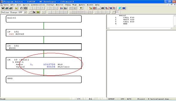 則上電運行後兩(liang) 個(ge) 程序都被激活,如果此時將X0置為(wei) ON這可以啟動main1的定位運動,在定位的過程中如果再將X1置為(wei) ON,則可將正在進行的定位運動的速度由65536PLS/sec改變成131072PLS/sec,速度提高一倍(新速度值也可以間接指定)。
