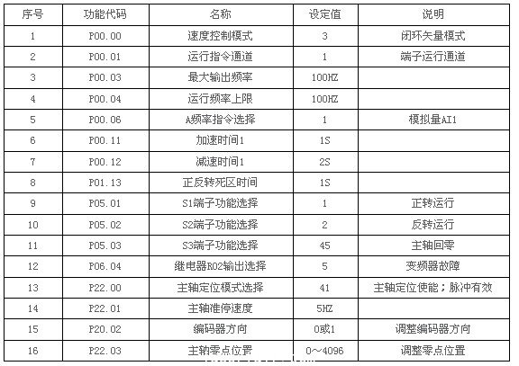 (1)編碼器參數及方向設定CNC數控係統、變頻器和速度脈衝(chong) 編碼器之間的連線接好後,然後測試編碼器。設置編碼器線數P20.01,設置P00.00=2,P00.10=20Hz,運行電機,此時電機旋轉為(wei) 20Hz,觀察P18.00的測速值應接近20Hz,如果測速值為(wei) 負,則表明編碼器方向反向了,設置P20.02=1即可,如果測速值偏差較大,則表明P20.01設置錯誤。觀察P18.02Z脈衝(chong) 計數值是否波動,如果波動,表明編碼器有幹擾或者P20.01設置錯誤,檢查接線及屏蔽線是否良好接地。(2)電機參數自學習(xi) 記錄電機銘牌參數,然後設置參數P02.00~P02.05。設置P00.00=1,開環矢量運行模式,並設置參數P00.15=1(旋轉參數自學習(xi) ),同時給運行命令,電機會(hui) 先靜止然後再旋轉到2/3的額定轉速,自學習(xi) 完成後,自動停機,鍵盤顯示-END-,並且將學習(xi) 得到的參數保存在P2組電機參數P02.06~P02.10中。注:進行上述動態自學習(xi) 時需要把電機軸與(yu) 機械負載脫開,而進行靜態自學習(xi) 則不需要脫開機械負載。(3)試運行電機設置P00.00=3,閉環矢量控製模式,同時設置運行指令通道及頻率給定源。調整加減速時間及P3組速度環及電流環PI參數,使之在整個(ge) 範圍內(nei) 運行平穩。(4)端子功能設定參考說明書(shu) P5,P6組輸入輸出端子功能進行端子功能的設定。注:Goodrive35說明文檔由Goodrive300產(chan) 品說明書(shu) 和Goodrive35附加說明書(shu) 共同組成。車床主軸加工工件時,轉速要求設定為(wei) 850r/min,采用閉環矢量控製模式,轉速波動小,穩速精度高。電機無異常噪音,無明顯抖動。當一個(ge) 工件加工完成後,切換到定位模式,主軸可以精準地回到最始位置。Goodrive35主軸定位專(zhuan) 用變頻器在數控車床上的應用,完全可以滿足客戶需求。