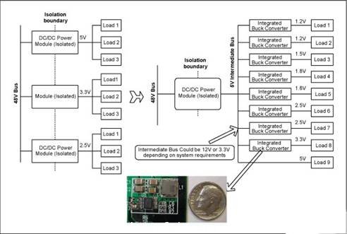 圖1. 與(yu) 電信單板上傳(chuan) 統的分布電源架構(左邊)相比,集成開關(guan) 調節器(右邊)具有更高效率和可靠性,能夠加快設計進程、縮小電路板麵積。