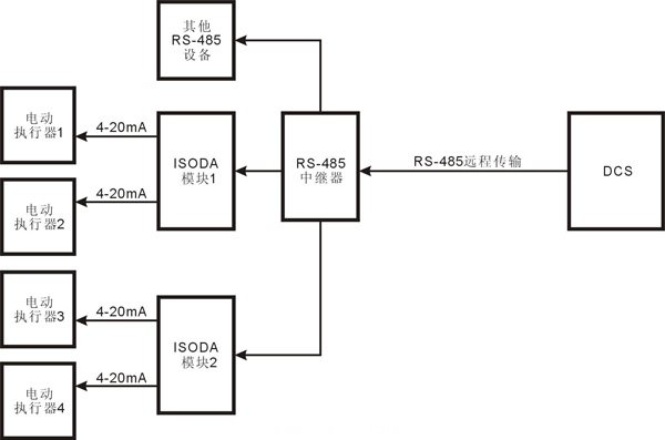 采用模擬信號輸入的電動執行器大多數采用4-20mA的電流信號來控製。利用一個(ge) ISODA O1-485模塊可以輸出兩(liang) 路4-20mA模塊,可以控製兩(liang) 個(ge) 電動執行器。ISODA模塊可以和其他智能設備掛在同一個(ge) RS-485總線上,在遠程控製中,還可以節約布線成本。下圖為(wei) ISO DAO模塊遠程控製電動執行器的一個(ge) 應用方案。