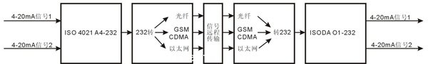 4-20mA模擬信號在工業(ye) 現場應用廣泛,下麵以4-20mA信號為(wei) 例,實現遠程傳(chuan) 輸與(yu) 還原。4-20mA模擬信號進入ISO 4021 A4-232模塊後轉換成數字量,通過RS-232接口,連接到RS-232轉光纖轉換器,或者RS-232轉GSM/CDMA轉換器,或者RS-232轉以太網轉換器,再通過光纖,或者GSM/CDMA,或者以太網遠程傳(chuan) 輸,在接收端再用相應的RS-232轉光纖轉換器,或者RS-232轉GSM/CDMA轉換器,或者RS-232轉以太網轉換器,將信號轉換成RS-232信號。RS-232信號輸出到ISODA O1-232模塊的RS-232接口,最後ISODA O1-232模塊輸出4-20mA的模擬信號,完成了遠程傳(chuan) 輸功能。