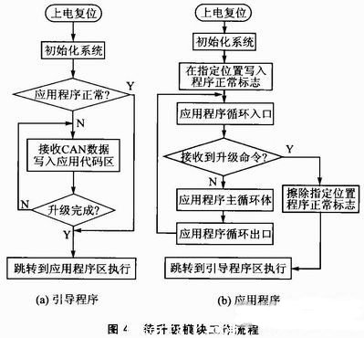 待升級模塊工作流程如圖4所示。分為(wei) 引導程序部分和應用程序部分,這兩(liang) 部分內(nei) 容在開發的時候是作為(wei) 兩(liang) 個(ge) 獨立的工程項目來完成的。