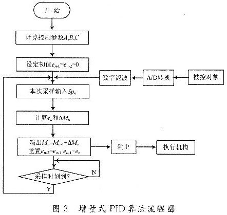 圖3給出了增量式PID控製算法的程序流程框圖。在進行初始化時,應根據係統性能要求選定參數KC,KI,KD和采樣時間TS,從(cong) 而確定係數A,B,C,並設置偏差初值en-1=en-2=0。