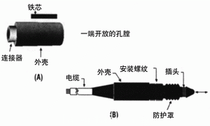 圖2 (A)典型的LVDT具有園柱型外殼和獨立的鐵芯 (B)標準頭結構LVDT具有內(nei) 置鐵芯組合件