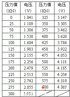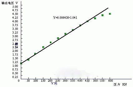圖4為(wei) 壓力值和輸出電壓值的關(guan) 係曲線,雖存在電橋電路的非線性,電阻應變片的非線性和彈性元件的非線性等因素,但由傳(chuan) 感器工作特性曲線我們(men) 可以看出,在重要工作區間(1~500KN),壓力值和輸出電壓值存在較好的線性關(guan) 係。
