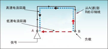 低速信號電流沿阻抗最小,即最短的路徑返回源端。而高速信號則是沿電感最小的路徑返回:這樣的最小的回路麵積位於(yu) 信號線的下麵,如圖1所示。