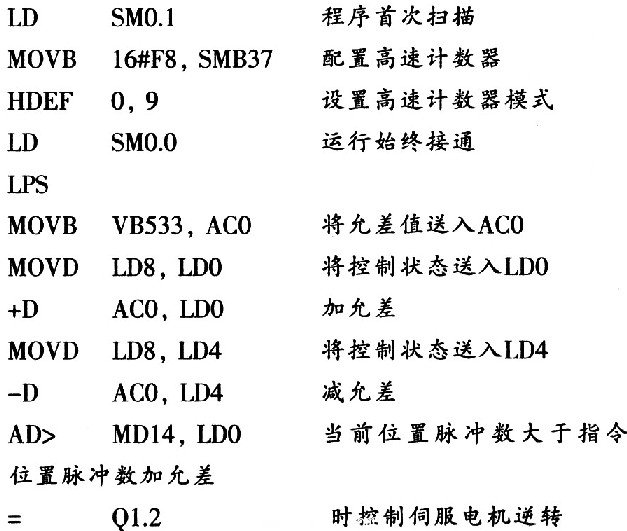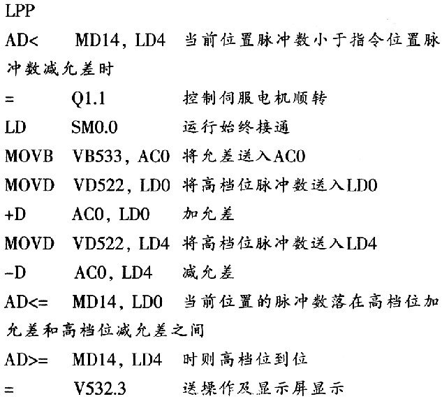 這種設計方法被利用在某軍(jun) 用雷達工程的衰減器控製的4位置定位係統中,係統要求驅動機械部件在0°~360°內(nei) 的4個(ge) 位置往返定位,定位精度要求O.1°。在具體(ti) 的設計中驅動電機選用型號為(wei) 55TYD02的交流電機,編碼機構選用型號為(wei) OMRON E6B2的相對式光電碼盤。位置的行程範圍360°對應於(yu) 8 400個(ge) 脈衝(chong) ,則使用S7-200 PLC高速計數器讀入的位置分辨率為(wei) 360°/8400=0.043°;根據機械結構實際標定位置允差值設置為(wei) 2個(ge) 脈衝(chong) ,此定位係統的控製精度可達到0.86°,滿足係統定位精度0.1°的要求,電機正向或反向運轉一次到位,快速準確。
