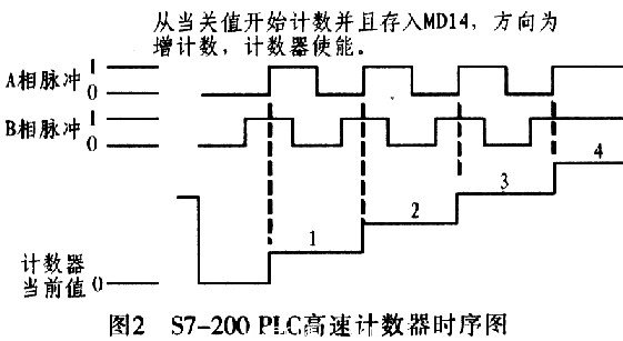 該係統設計核心部件采用西門子S7-200係列的PLC,該係列PLC功能豐(feng) 富,具有多種功能模塊,可方便通過人機界麵對設備進行操作和監視其狀態,高版本的PLC主機擁有2個(ge) 通訊端口,在使用人機界麵對設備進行操作的同時還可通過RS-485接口和計算機實現邏輯運算及狀態管理,對設備進行遠程控製和監視。該係統使用S7-200 PLC的一個(ge) 重要的功能:高速可逆計數。光電編碼器和伺服電機同軸連接,伺服電機旋轉帶動光電編碼器產(chan) 生連續的脈衝(chong) 串,PLC通過輸入點讀取光電編碼器產(chan) 生的脈衝(chong) ,實現高速可逆計數。例如設置高、中、低3個(ge) 給水量檔位並進行控製。在調試階段應先驅動伺服電機進行3個(ge) 給水量的位置標定,也就是說,高、中、低3個(ge) 檔位分別對應唯一的脈衝(chong) 數。應該注意的是,由於(yu) 采用的是增量式光電編碼器,也就是說,當編碼器掉電後並不能將當前的脈衝(chong) 數保存。所以在旋轉機構上還要設置2個(ge) 限位開關(guan) ,一來保護機械結構;二來把逆向的限位開關(guan) 的位置定為(wei) 零位,這樣相對於(yu) 這個(ge) 零位的高、中、低3個(ge) 給水檔位從(cong) 光電編碼器讀到的脈衝(chong) 數即為(wei) 這3個(ge) 檔位的位置。這3個(ge) 位置可通過PLC編程對其控製。圖2給出S7-200 PLC高速可逆計數器的時序圖。
