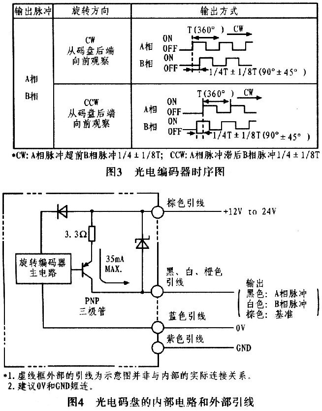 光電編碼器,是一種通過光電轉換將輸出軸上的機械幾何位移量轉換成脈衝(chong) 或數字量的傳(chuan) 感器。這是目前應用最多的傳(chuan) 感器,光電編碼器是由光柵盤和光電檢測裝置組成。光柵盤是在一定直徑的圓板上等分地開通若幹個(ge) 長方形孔。由於(yu) 光電碼盤與(yu) 電動機同軸,電動機旋轉時,光柵盤與(yu) 電動機同速旋轉,經發光二極管等電子元件組成的檢測裝置檢測輸出若幹脈衝(chong) 信號,此外,為(wei) 判斷旋轉方向,碼盤還可提供相位相差90°的兩(liang) 路脈衝(chong) 信號。圖3為(wei) 在實際項目中采用光電編碼器的時序圖,從(cong) 圖中可以看出此光電編碼器的相位判斷角度為(wei) 90°±45°;另外圖中標識的CW(順時針)和CCW(逆時針)可以根據實際應用在PLC程序中自行定義(yi) 。圖4為(wei) 在實際項目中采用光電編碼器的內(nei) 部電路和外部引線圖。