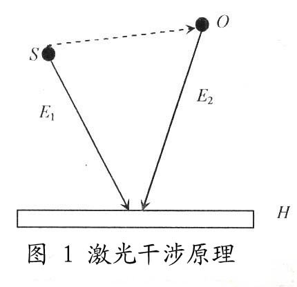 光源S處發出的頻率為(wei) f、波長為(wei) λ的激光束一部分投射到記錄介質H(比如全息幹板)上,光波的複振幅記為(wei) E1,另一部分經物體(ti) O表麵反射後投射到記錄介質H上,光波的複振幅記為(wei) E2。其中:
