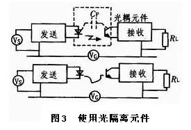 用光傳(chuan) 輸信號是解決(jue) 地環路問題的理想方法。如圖3所示,光耦器件的寄生電容為(wei) 2 pF左右,因此能夠在很高的頻率起到隔離作用。如果使用光纖,則沒有寄生電容的問題,能夠獲得十分完善的隔離效果。但是,用光纖會(hui) 帶來其它問題,如:需要更大的功率、需要更多的外圍器件,光連接的線形和動態範圍都達不到模擬信號的要求、光纜的安裝和維護比較複雜等,使用時應注意。