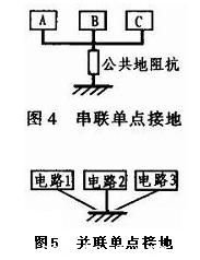 消除公共阻抗耦合的途徑有兩(liang) 個(ge) ,一個(ge) 是減小公共地線部分的阻抗,這樣公共地線上的電壓也隨之減小,從(cong) 而控製公共阻抗耦合。另一個(ge) 方法是通過適當的接地方式避免容易相互幹擾的電路共用地線,一般要避免強電電路與(yu) 弱電電路共用地線,數字電路與(yu) 模擬電路共用地線等。並聯接地的缺點是接地的導線過多。因此在實際中,沒有必要所有電路都並聯單點接地,對於(yu) 相互幹擾較少的電路,可以采用串聯單點接地。例如,可以將電路按照強信號,弱信號,模擬信號,數字信號等分類,然後在同類電路內(nei) 部用串聯單點接地,如圖4所示,不同類型的電路采用並聯單點接地,如圖5所示。當信號頻率低於(yu) 1 MHz時可采用單點接地的方法,使其不形成回路。信號頻率高於(yu) 10 MHz時最好采用多點接地,盡量降低地線阻抗。電源線與(yu) 地線應盡量靠近走線以減少所包圍的環路麵積,從(cong) 而減少外界磁場對環路切割產(chan) 生的電場幹擾,同時也減少環路對外電磁輻射。
