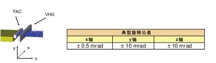 圖1所示的是采用外部波長穩定方案的半導體(ti) 激光器bar條的典型組成。VHG的角度敏感性有利於(yu) 減少半導體(ti) 激光器bar條的發散,特別是在快軸方向上利用快軸準直#p#分頁標題#e#透鏡(FAC)來準直光束。VHG將顯著提高光學反饋。VHG直接置於(yu) FAC之後。圖1中的表格所示的是有效波長穩定所需的典型對準公差。