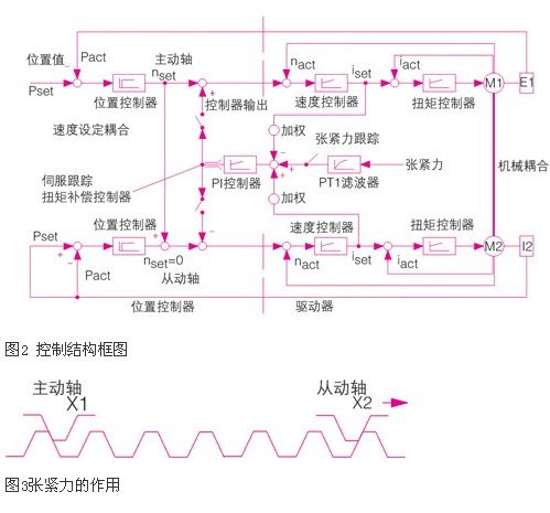 在西門子數控係統主從(cong) 控製功能中,兩(liang) 個(ge) 伺服電機(主和從(cong) )在機械上是連接在一起的,並且隻需一個(ge) 位置編碼器做位置控製。有位置編碼器的伺服電機作為(wei) 主動軸,從(cong) 動軸隻有速度控製沒有位置控製,從(cong) 動軸的速度值與(yu) 主動軸的速度設定值一致,兩(liang) 個(ge) 軸的速度控製器保持獨立。設定主從(cong) 耦合,從(cong) 動軸就以主動軸的速度設定移動,從(cong) 動軸隻有速度控製沒有位置控製。主動軸和從(cong) 動軸執行無位置偏差的控製,扭矩補償(chang) 控製器把扭矩均勻分布在主動軸和從(cong) 動軸上,用附加扭矩在主動軸和從(cong) 動軸之間產(chan) 生張緊力。圖2為(wei) 控製結構框圖。