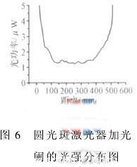 從(cong) 圖中可以看出,圓光斑的光強分布要均勻很多,通過計算得到圓光斑比橢圓光斑激光器的均勻度要好約46%。這主要是由於(yu) 橢圓光斑激光器的光斑直徑大,且不均勻,而圓光斑的直徑小,且光束分布比較集中,準直性較好。為(wei) 了進一步提高均勻性,選擇在光束打到鮑威爾棱鏡前加光闌,對光束直徑再進行限製。光強分布圖如圖6。