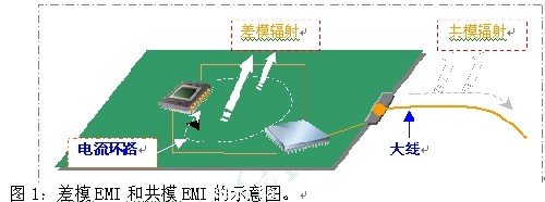 在PCB電路板中,電磁能的存在有兩(liang) 種形式,即差模EMI和共模EMI。當器件輸出的電流流入一個(ge) 負載時,就會(hui) 產(chan) 生差模EMI。當電流流經多個(ge) 導電平麵,如PCB上的導線組或電纜,就會(hui) 產(chan) 生共模EMI。圖1給出了差模EMI和共模EMI的示意圖。