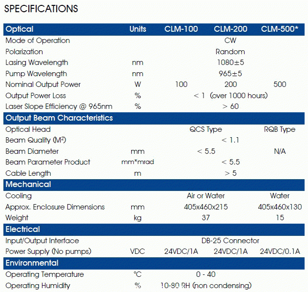 以下是CorALIGHT CLM 係列光纖激光模塊的技術參數: