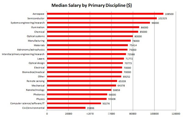 航空航天和軍(jun) 事領域再次被證明是光子學行業(ye) 內(nei) 收入最高的。航空航天產(chan) 業(ye) 員工的平均工資為(wei) 108500美元,半導體(ti) 行業(ye) (今年新增的一個(ge) 類別)排在第二,才剛剛超過102000美元。排在薪酬表最低端的是土木工程或者環境工程專(zhuan) 業(ye) 的產(chan) 業(ye) 工人,全球平均工資僅(jin) 為(wei) 36000美元。
