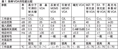 隨著VOA在光通信中的應用越來越多,對其功能的要求也越來高。VOA應能精確地控製光信號的功率,為(wei) 所有通信波長提供穩定的衰減量;在超長距離DWDM係統中,VOA還必須對隨環境影響而逐漸變化的信號有反應;在動態網絡節點上,VOA的響應時間應在ms級。VOA的技術指標主要包括:工作波長範圍、動態範圍、插入損耗、偏振相關(guan) 損耗、響應時間、溫度特性、工作溫度等。下麵就各種技術做一簡單比較,見表1。#p#分頁標題#e#