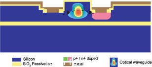 另一種直接基於(yu) 電吸收(EA)調製,利用載流子注入改變吸收係數來實現光功率的衰減。如圖7所示,在PN結之間加入一層單模光波導層,當未加電時,從(cong) 光纖出射的單模光,進入單模光波導層後,仍然是傳(chuan) 導模,被限製在這一層中繼續傳(chuan) 播,並從(cong) 另一光纖輸出;當加載電壓時,由於(yu) 載流子的注入,單模光波導的吸收係數增大,從(cong) 而部分光被吸收掉。並且隨著電壓的增加,流過PN結的電流也隨著增加,使得更多的光子被吸收,衰減增大。